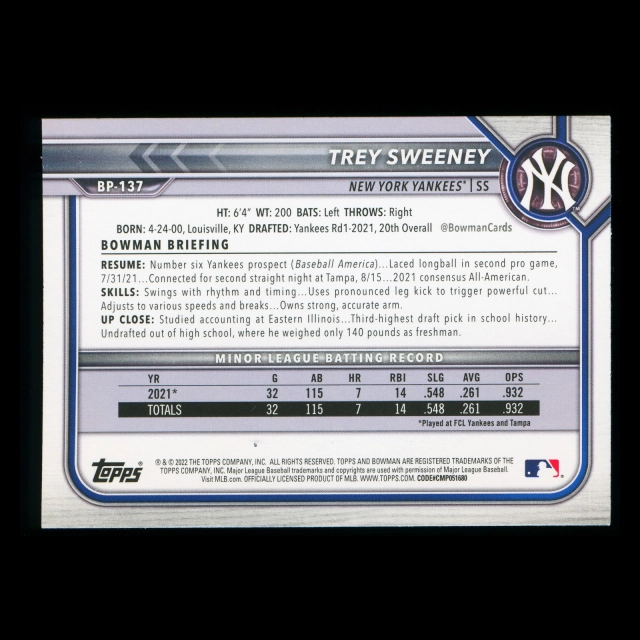 Trey Sweeney 2022 Bowman 1st Prospect Yankees
