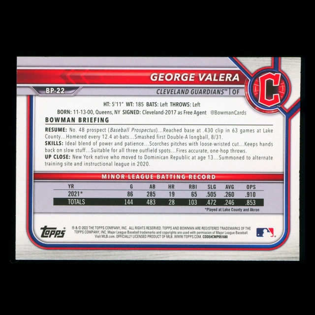 George Valera 2022 Bowman 1st Prospect Guardians