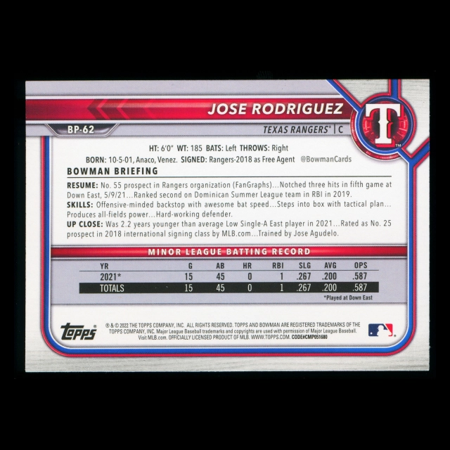 Jose Rodriguez 2022 Bowman 1st Prospect Rangers