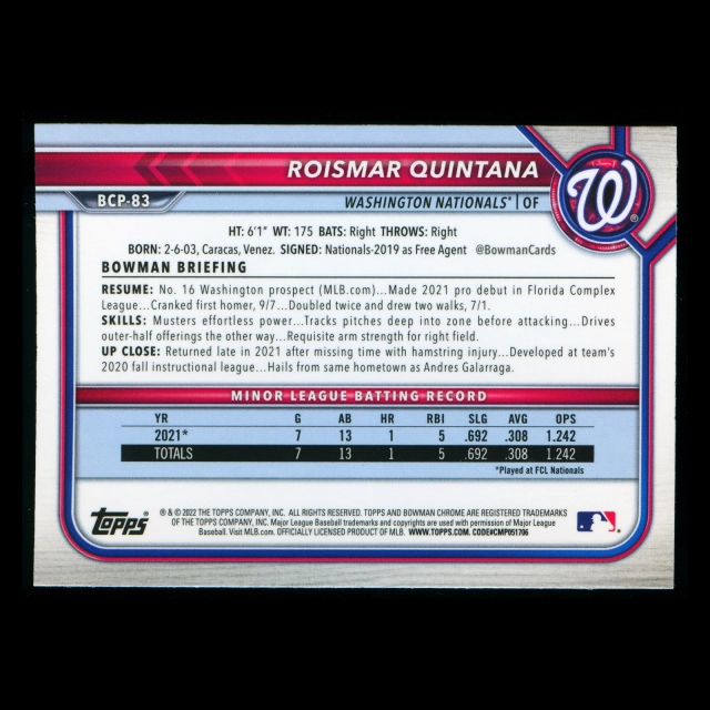 Roismar Quintana 2022 Bowman Chrome 1st Bowman Prospects Nationals