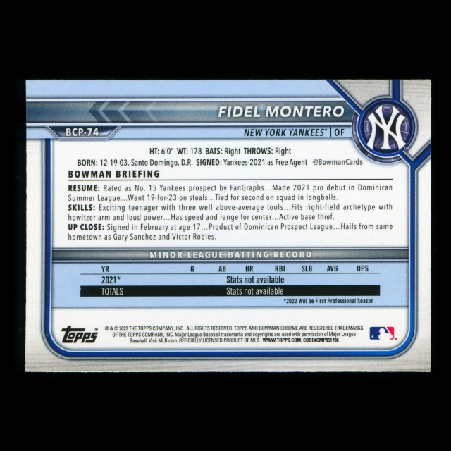 Fidel Montero 2022 Bowman Chrome 1st Bowman Prospects Yankees