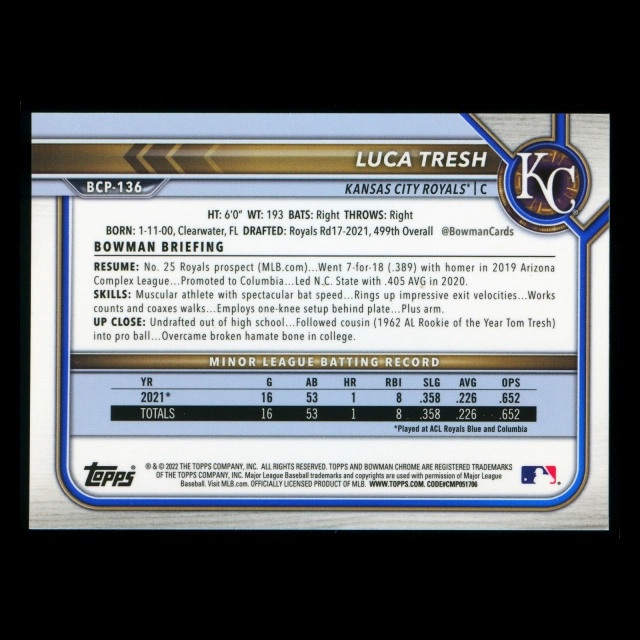 Luca Tresh 2022 Bowman Chrome 1st Bowman Prospects Blue RayWave Refractors Royals 20/150