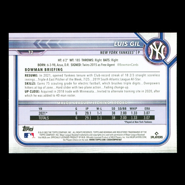 Luis Gil RC 2022 Bowman Rookie Yankees