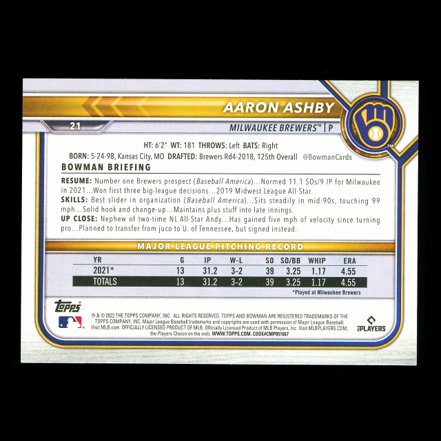 Aaron Ashby RC 2022 Bowman Rookie Brewers