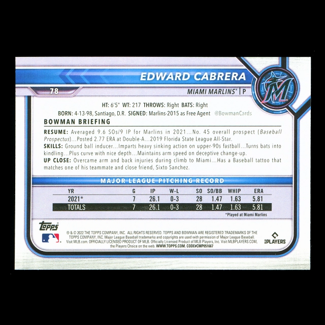 Edward Cabrera RC 2022 Bowman Rookie Marlins