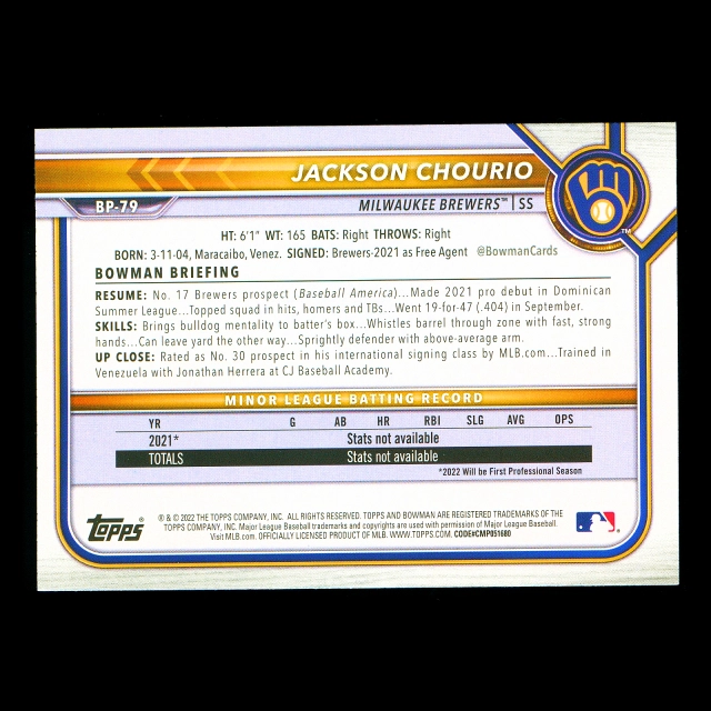 Jackson Chourio 2022 Bowman Prospects 1st Bowman Brewers