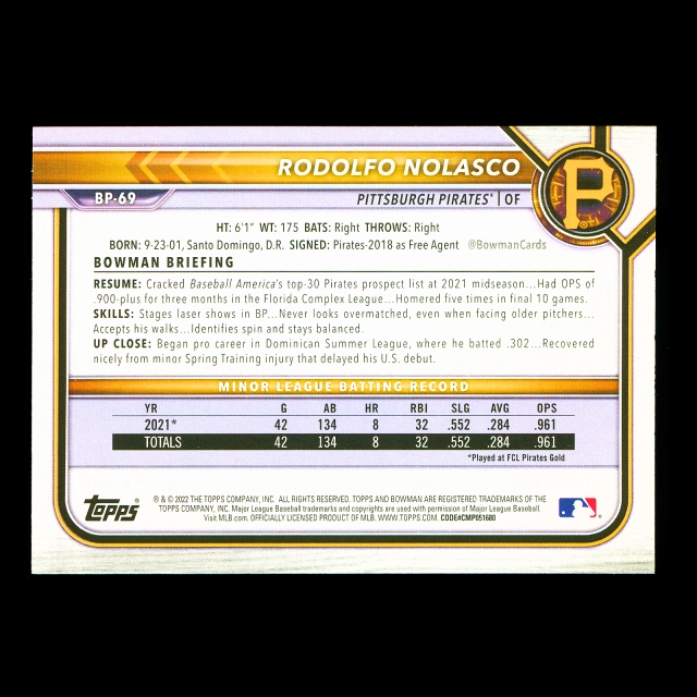 Rodolfo Nolasco 2022 Bowman Prospects 1st Bowman Pirates