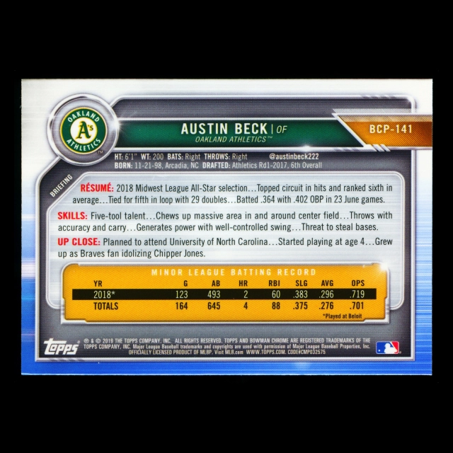 Austin Beck 2019 Bowman Chrome Prospects Athletics