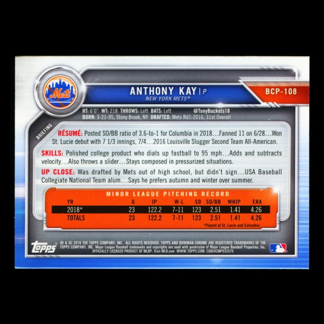 Anthony Kay 2019 Bowman Chrome Prospects Mets