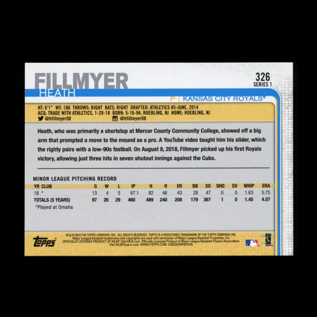 Heath Fillmyer RC 2019 Topps Rookie Royals