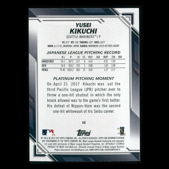 Yusei Kikuchi RC 2019 Bowman Platinum Rookie Mariners