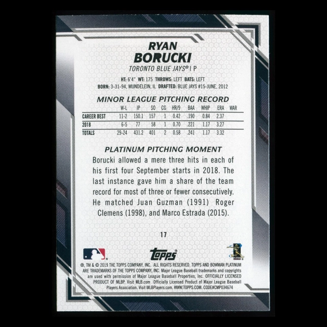 Ryan Borucki RC 2019 Bowman Platinum Rookie Blue Jays