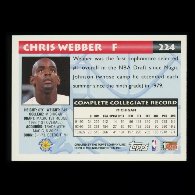 Chris Webber 1994-95 Topps 1st Round NBA Draft Warrios