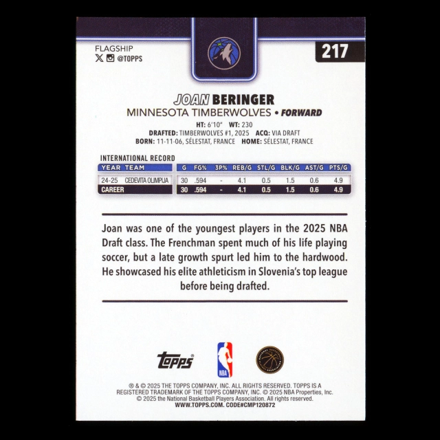 Joan Beringer RC 2025-26 Topps Rookie Timberwolves