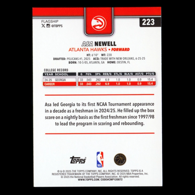 Asa Newell RC 2025-26 Topps Rookie Hawks