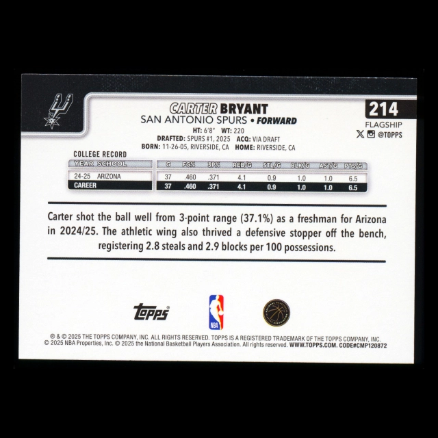Carter Bryant RC 2025-26 Topps Rookie Spurs