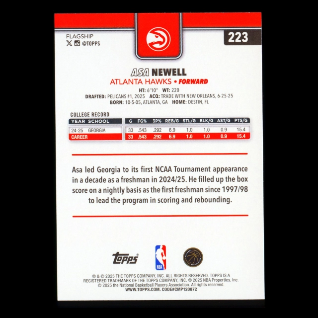 Asa Newell RC 2025-26 Topps Rookie Hawks