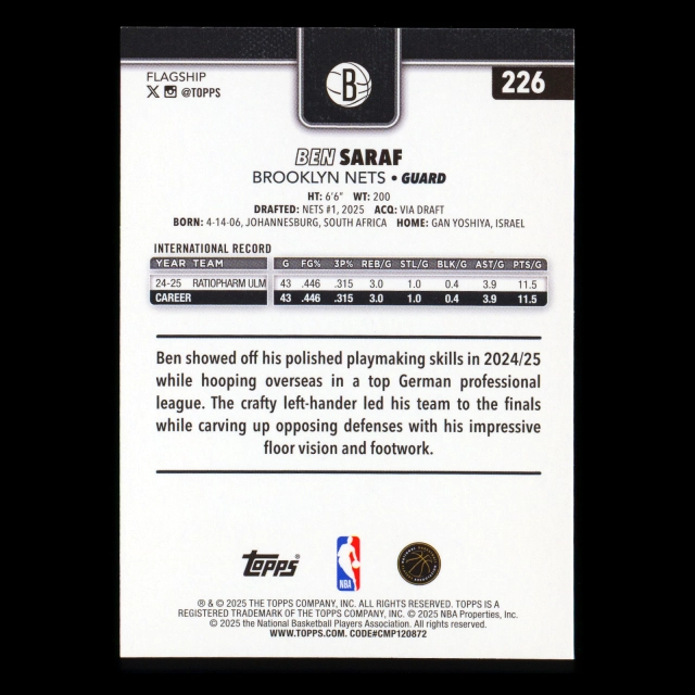 Ben Saraf RC 2025-26 Topps Rookie Nets