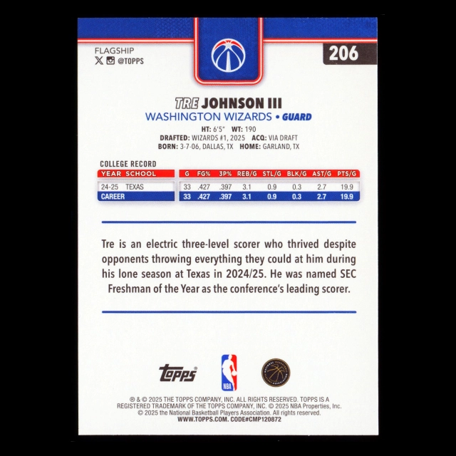 Tre Johnson III RC 2025-26 Topps Rookie Wizards