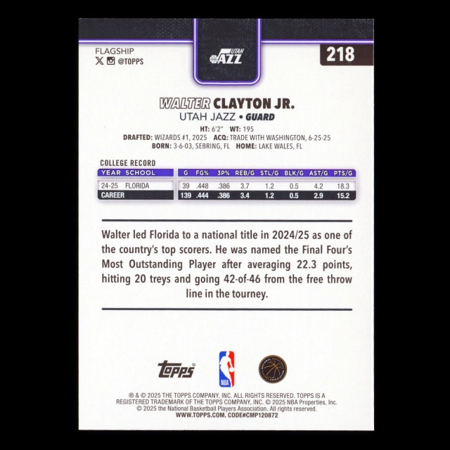 Walter Clayton Jr. RC 2025-26 Topps Rookie Jazz
