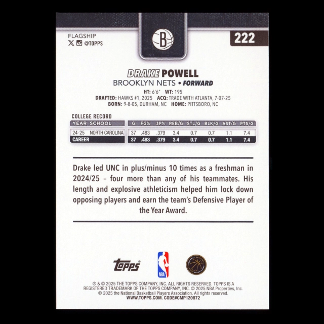 Drake Powell RC 2025-26 Topps Rookie Nets