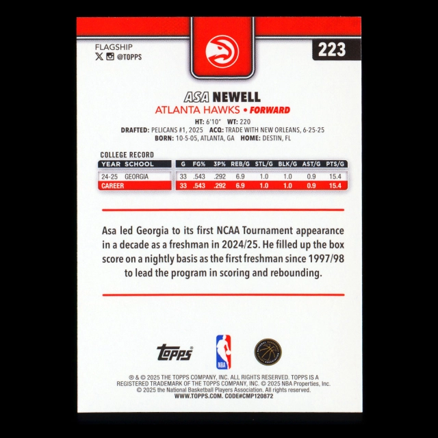 Asa Newell RC 2025-26 Topps Rookie Hawks