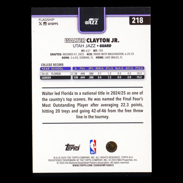 Walter Clayton Jr. RC 2025-26 Topps Rookie Jazz