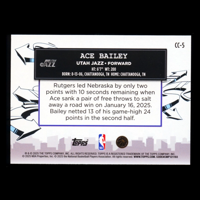 Ace Bailey RC 2025-26 Topps Clutch City Prospects Rookie Jazz