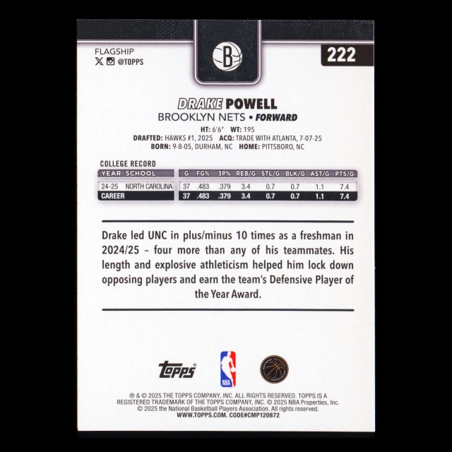 Drake Powell RC 2025-26 Topps Rookie Nets