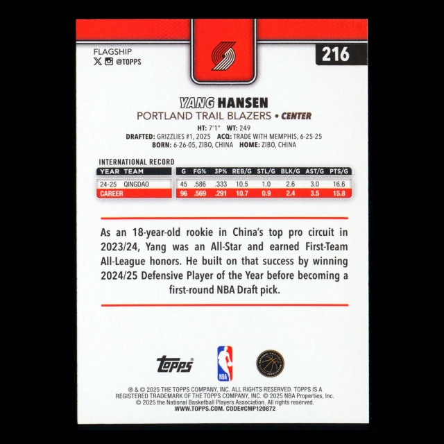 Yang Hansen RC 2025-26 Topps Rookie Trail Blazers