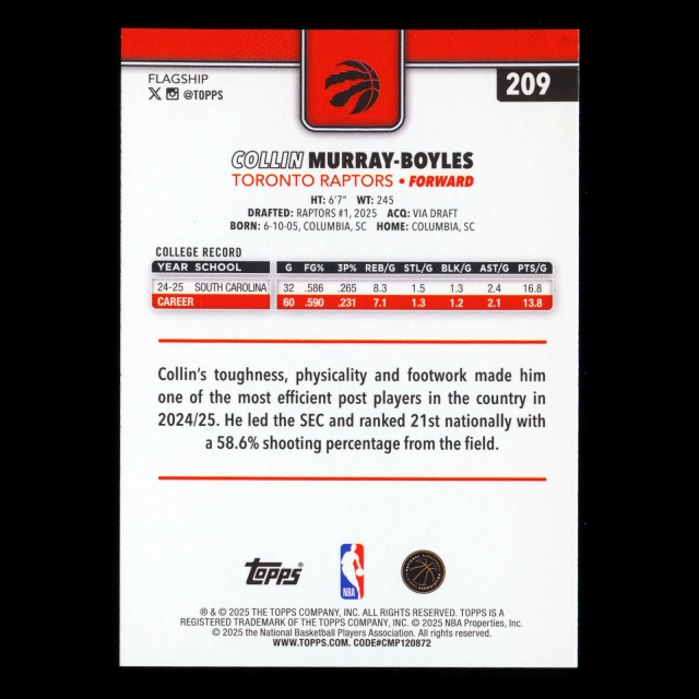 Collin Murray-Boyles RC 2025-26 Topps Rookie Raptors