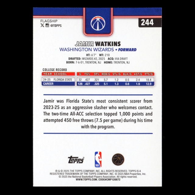 Jamir Watkins RC 2025-26 Topps Rookie Wizards