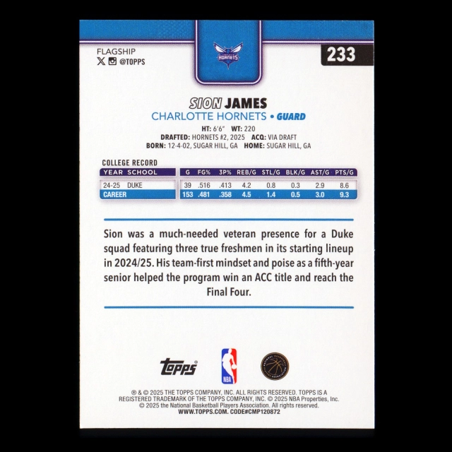 Sion James RC 2025-26 Topps Rookie Hornets