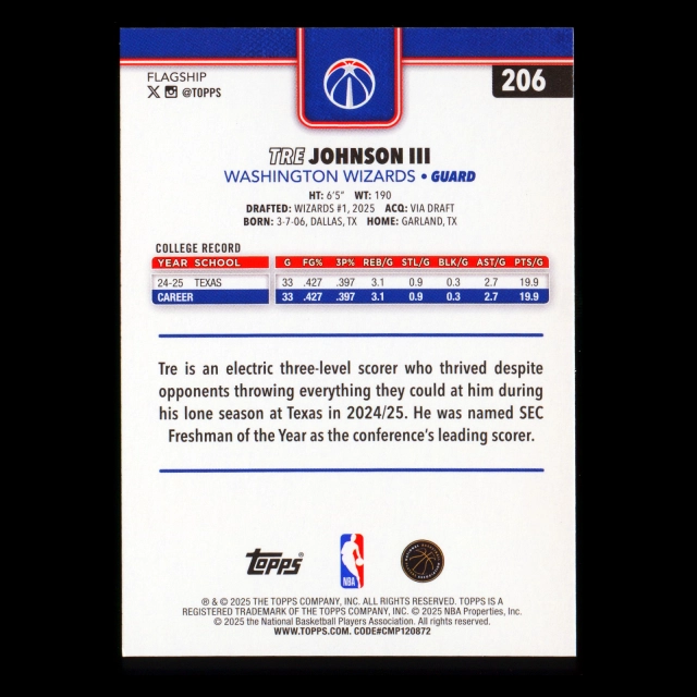 Tre Johnson III RC 2025-26 Topps Rookie Wizards