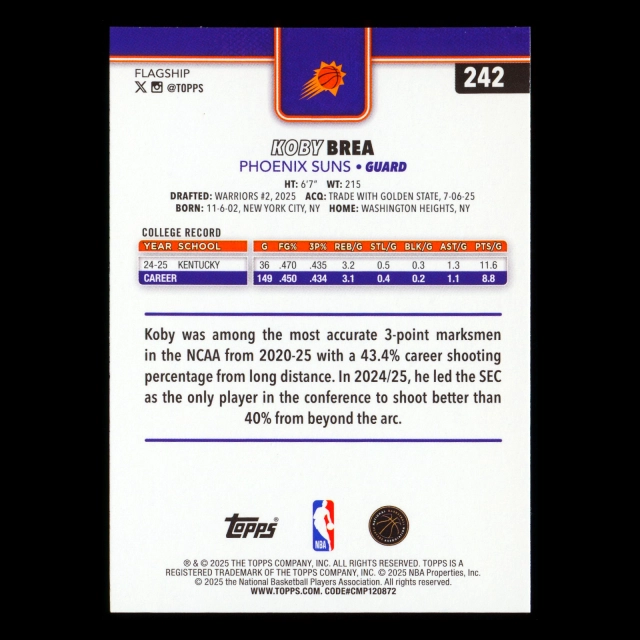 Koby Brea RC 2025-26 Topps Rookie Suns
