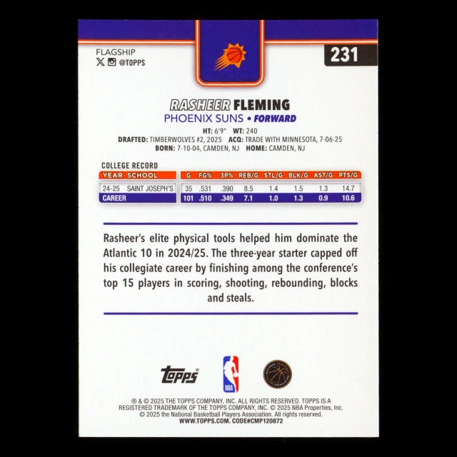 Rasheer Fleming RC 2025-26 Topps Rookie Suns