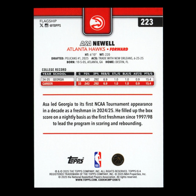 Asa Newell RC 2025-26 Topps Rainbow Foil Rookie Hawks