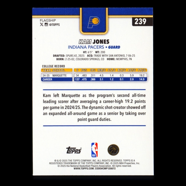 Kam Jones RC 2025-26 Topps Rookie Pacers