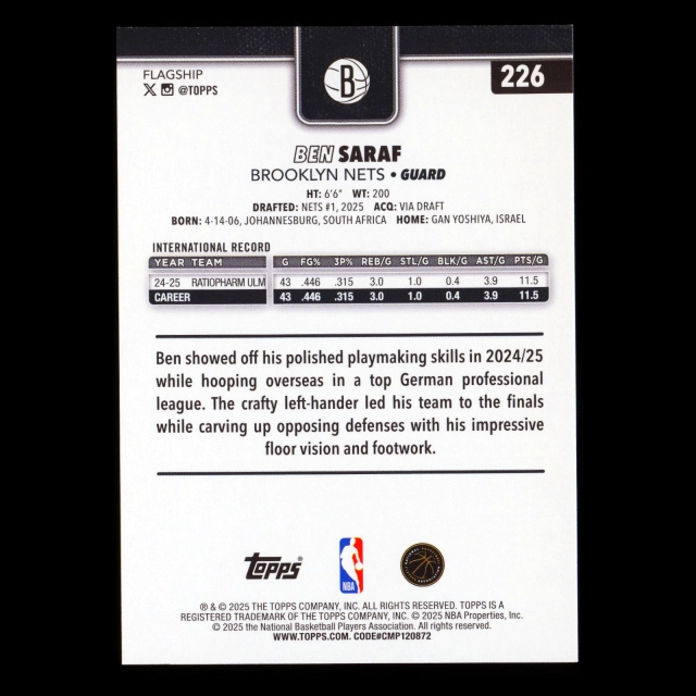 Ben Saraf RC 2025-26 Topps Rookie Nets