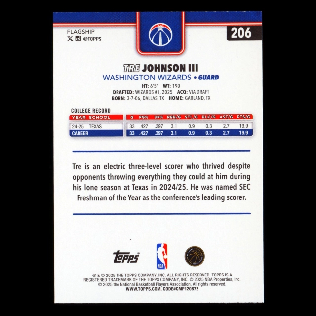 Tre Johnson III RC 2025-26 Topps Rookie Wizards