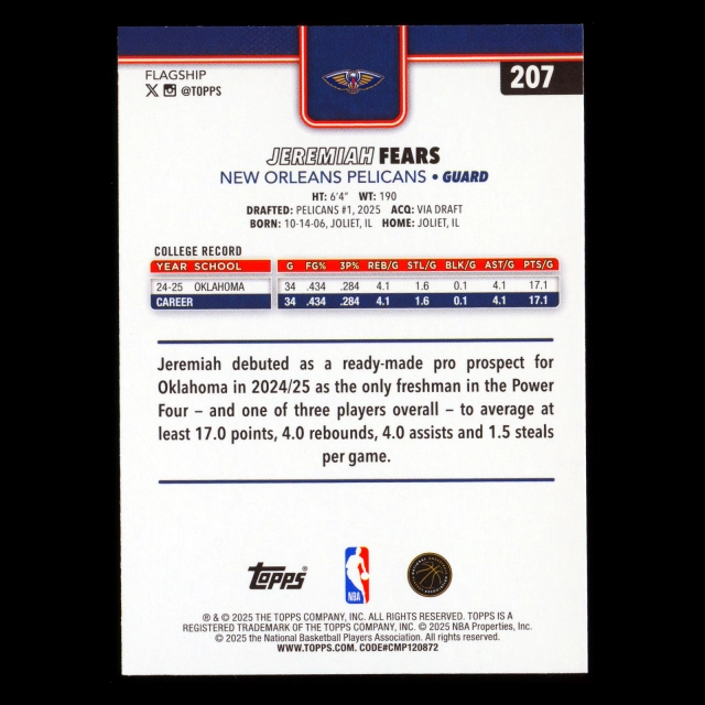 Jeremiah Fears RC 2025-26 Topps Rookie Pelicans