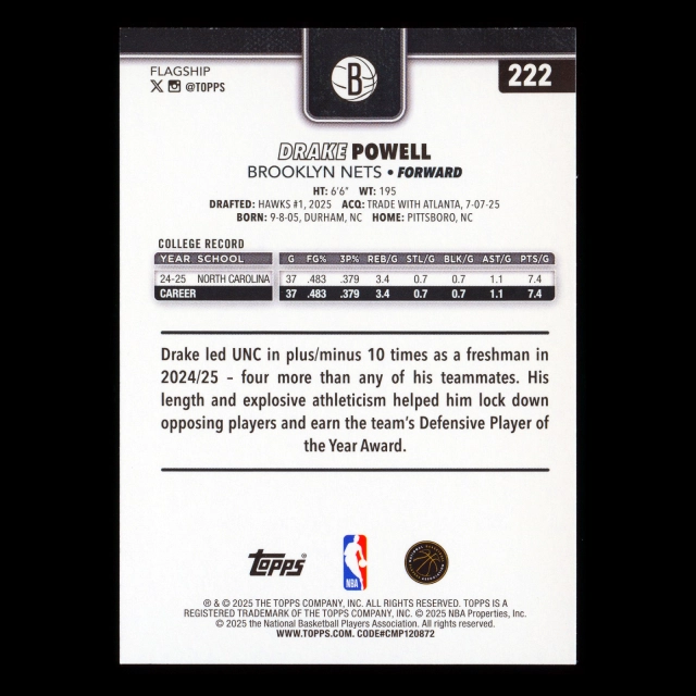 Drake Powell RC 2025-26 Topps Rookie Nets