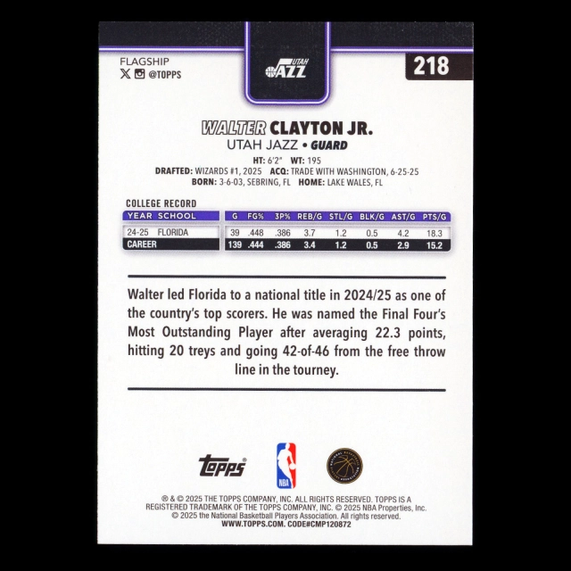 Walter Clayton Jr. RC 2025-26 Topps Rookie Jazz