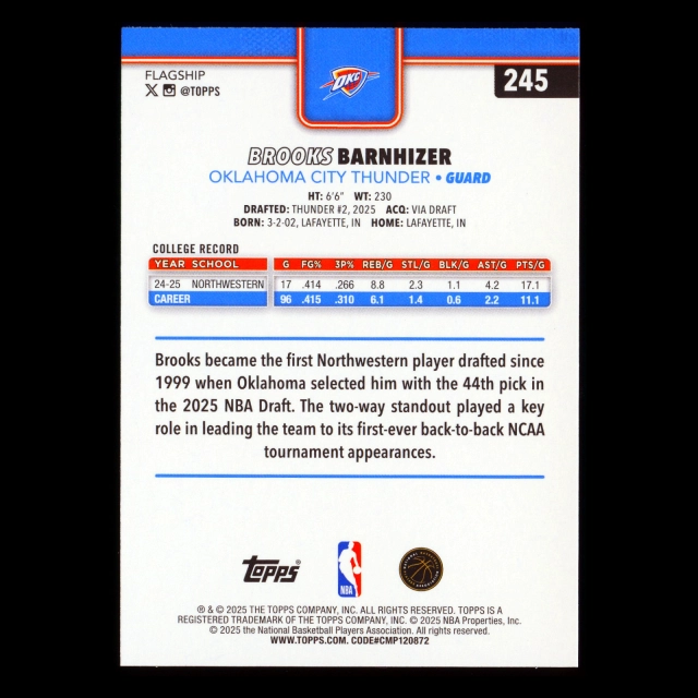 Brooks Barnhizer RC 2025-26 Topps Rookie Thunder
