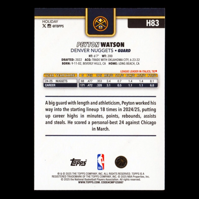 Peyton Watson 2025-26 Topps Holiday Glitter Holiday Nuggets