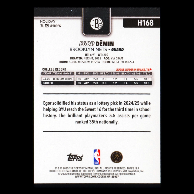 Egor Dmin RC 2025-26 Topps Holiday Rookie Nets