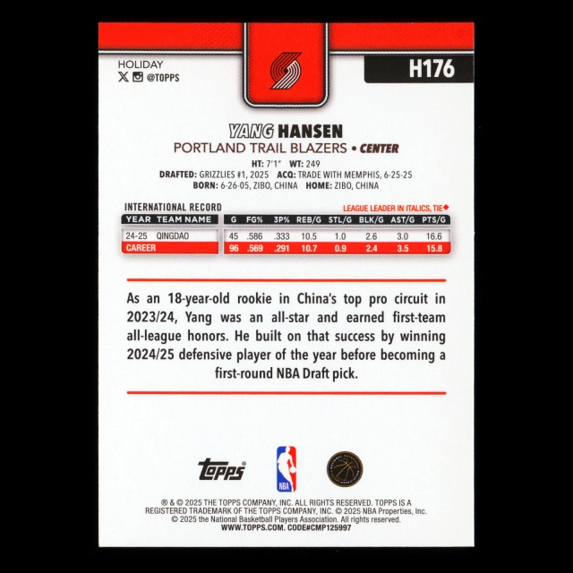 Yang Hansen RC 2025-26 Topps Holiday Rookie Trail Blazers