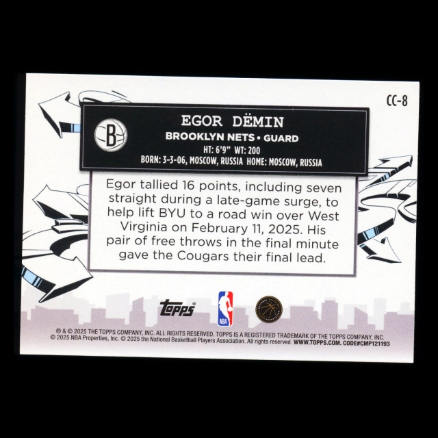 Egor Demin RC 2025-26 Topps Clutch City Prospects Rookie Nets