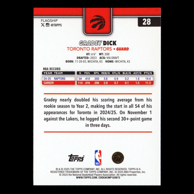 Gradey Dick 2025-26 Topps Season Tip Off Raptors