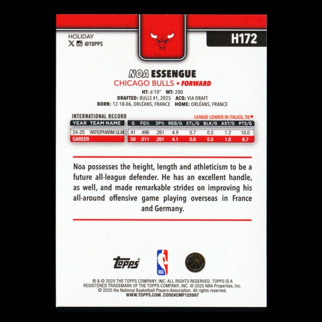 Noa Essengue RC 2025-26 Topps Holiday Glitter Holiday Rookie Bulls